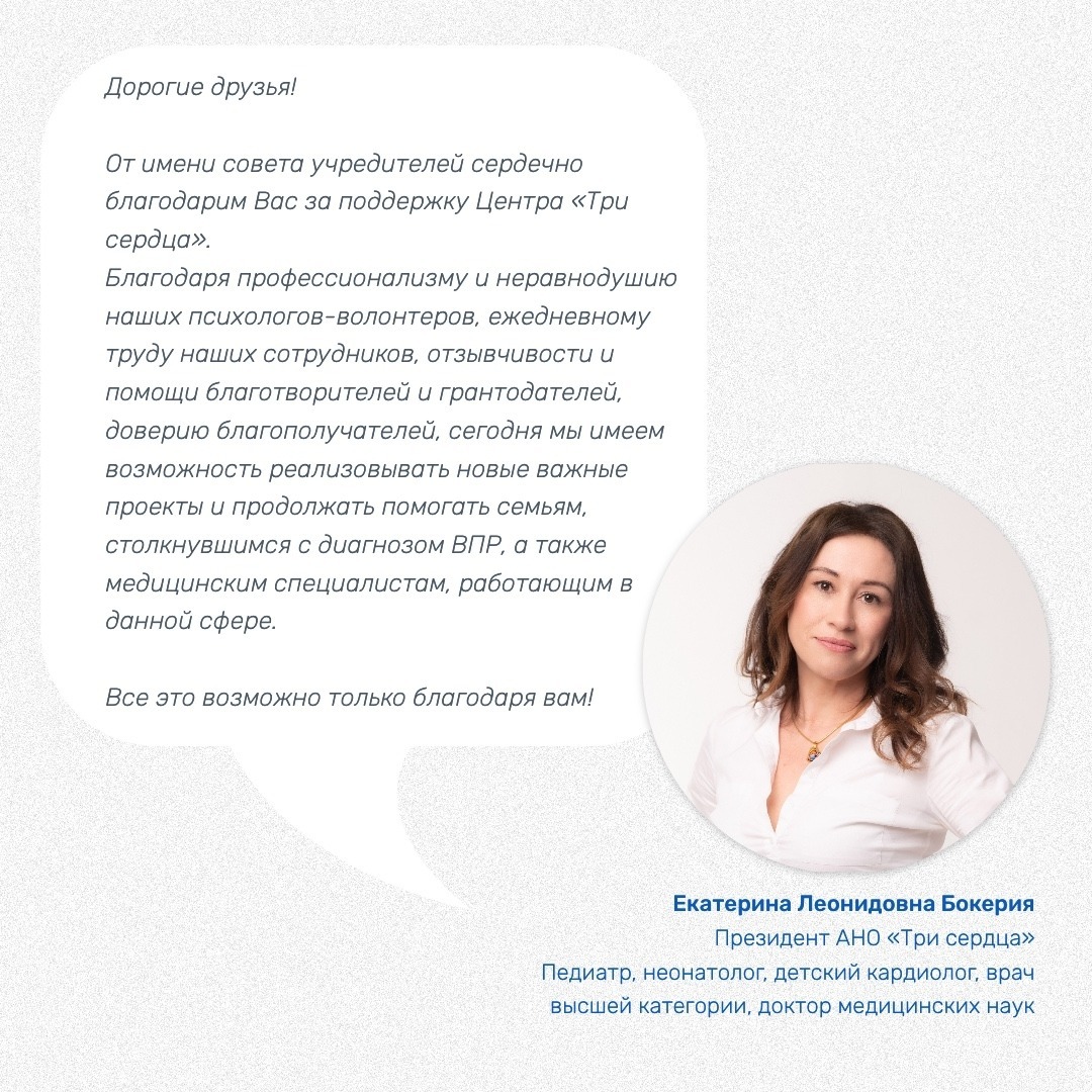«От имени совета учредителей сердечно благодарим Вас за поддержку Центра «Три сердца». Благодаря профессионализму и неравнодушию наших психологов-волонтеров, ежедневному труду наших сотрудников, отзывчивости и помощи благотворителей и грантодателей, доверию благополучателей, сегодня мы имеем возможность реализовывать новые важные проекты и продолжать помогать семьям, столкнувшимся с диагнозом ВПР, а также медицинским специалистам, работающим в данной сфере».
