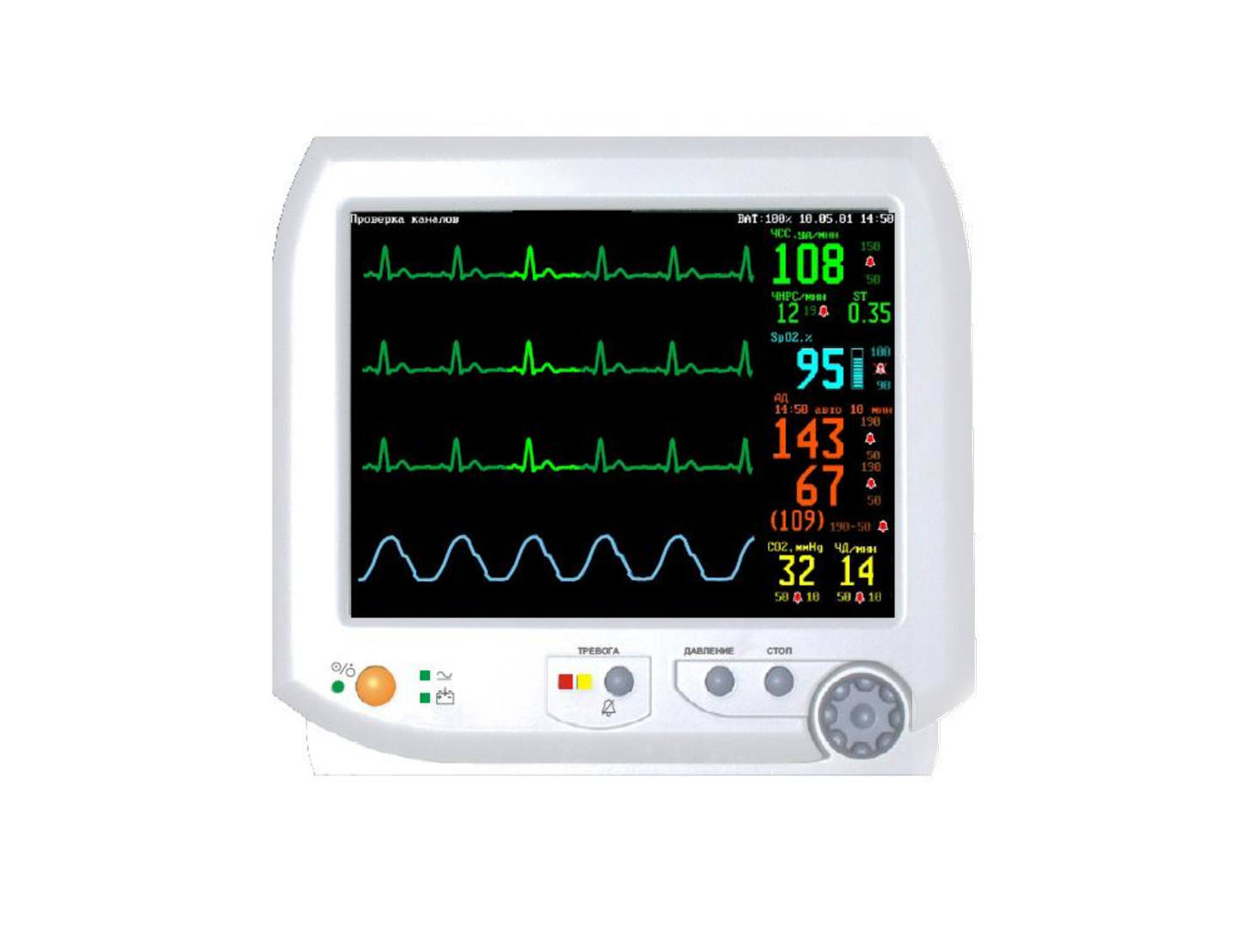 Монитор отображающий жизненно важные показатели, включая частоту сердечных сокращений, насыщение кислородом, артериальное давление и формы дыхательных волн